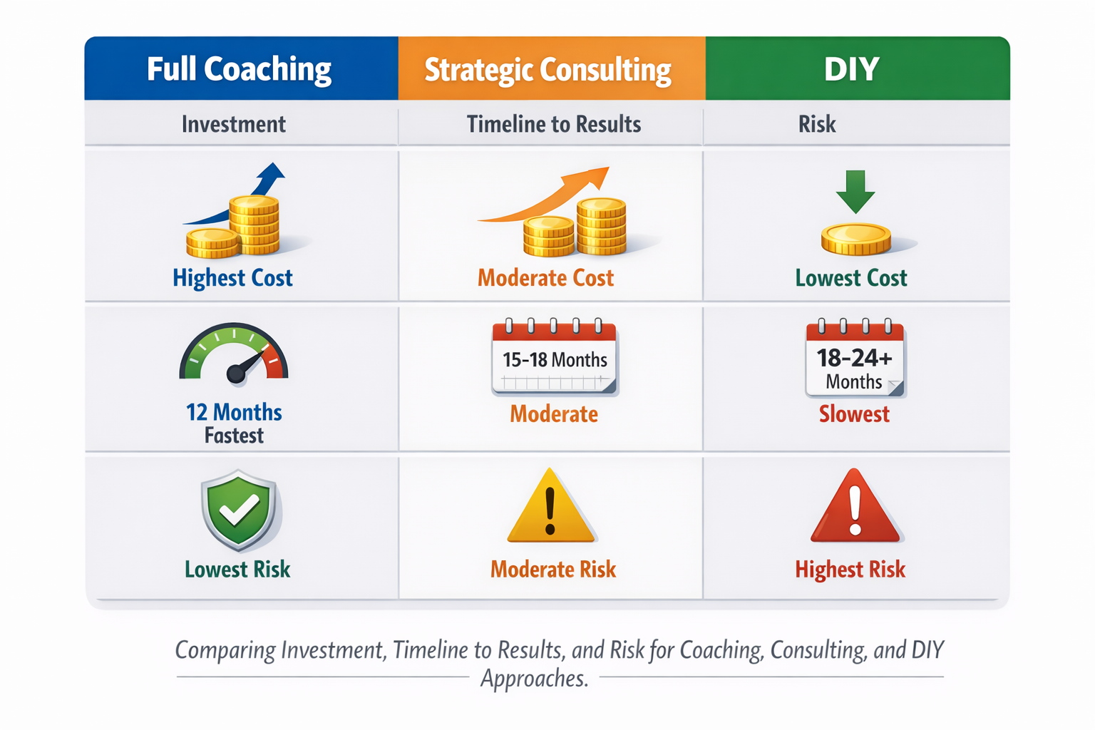 | Factor | Full Coaching | Strategic Consulting | DIY |