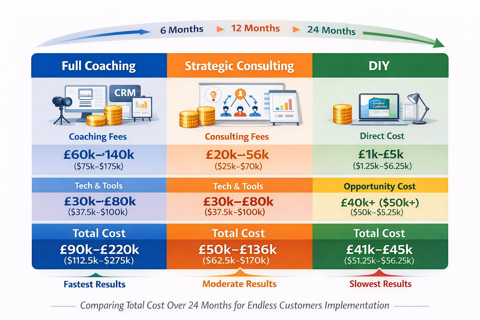 Beyond direct coaching or consulting fees, all three approaches require investment in tools like a CRM, website platform, video equipment, and potentially self-service tools like pricing calculators. Most businesses spend £15,000–£40,000 ($18,750–$50,000) annually on these supporting technologies regardless of which implementation path they choose.